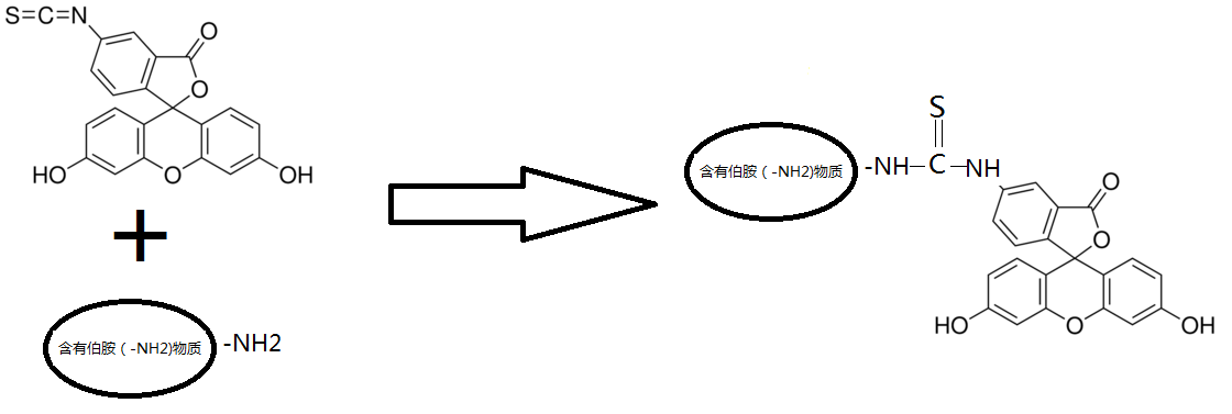 本FITC标记试剂盒提供了FITC快速标记所需全部试剂,用于含有伯氨基(NH2-)的蛋白/抗体/多肽或者其他大分子的标记,待标记物上的赖氨酸残基的游离ε-氨基可与FITC 发生亲核反应,形成硫脲连接而共价结合,形成的偶联物的稳定性很好,其反应原理如下: