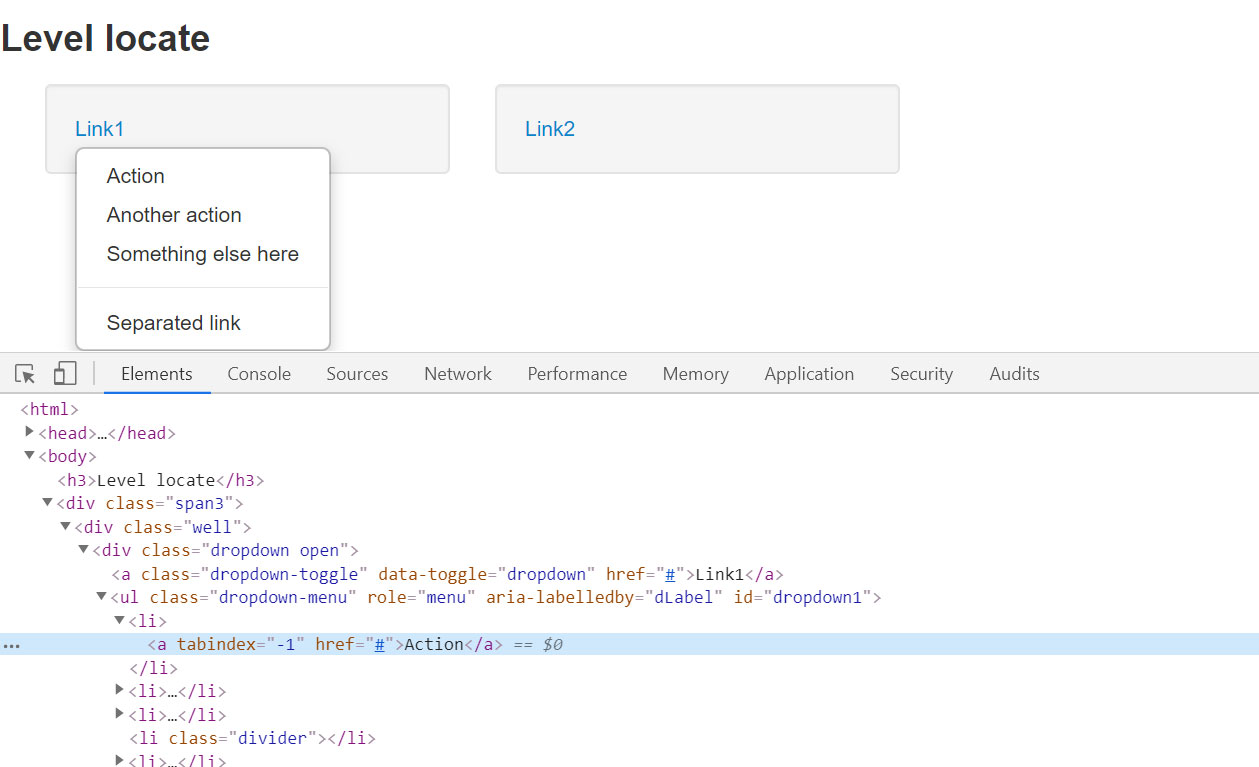 思路:先点击显示出1个下拉菜单,然后再定位到该下拉菜单所在的ul,再定位这个ul 下的某个具体的link。在这里,定位第1个下拉菜单中的Action 这个选项。