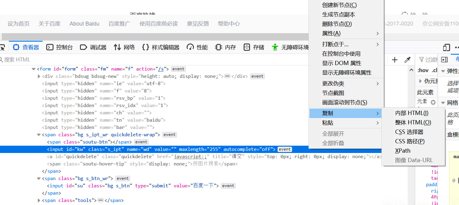 在元素的定位行,右击选择复制,进行css选择器的复制