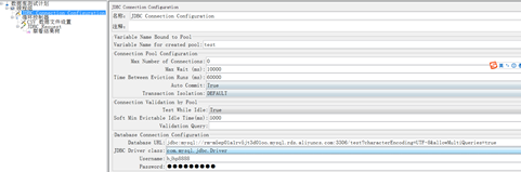 Variable Name Bound to Pool:数据库连接池的名称。可以有多个jdbc connection configuration ,每个可以起不同的名称,在Jmeter其他元件中只要需要用到数据库的连接信息,直接引用该变量的变量名即可。可以理解为如果Jmeter其他的元件要获取数据库的连接信息,可以通过这个名称进行获取。