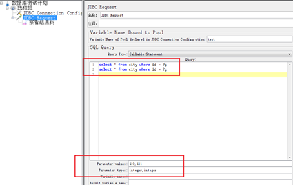 变更:JDBC Request—Query Type配置:Callable Statement