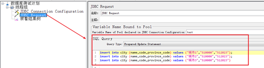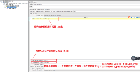 Variable Name Bound to Pool :引用JDBC Connection Configuration元件里面的参数值【test】写法两边保持一致即可,不需要使用${}进行引用。错误的不存在的参数不能被引用。