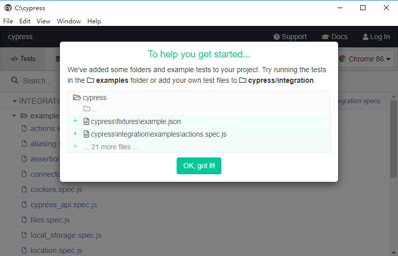 执行yarn run cypress open启动Cypress