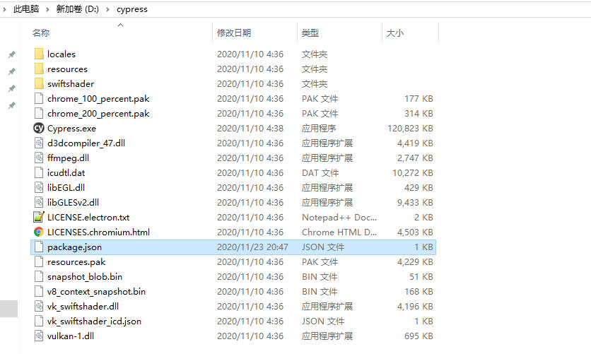 在D:\cypress\node_modules\cypress目录下会自动生成一个package.json文件,作用是一样的