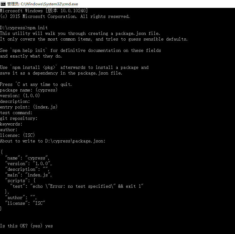执行npm init命令来生成package.json文件,首先将命令行引导到解压好的cypress目录下,然后执行npm init它会引导你配置生成package.json文件