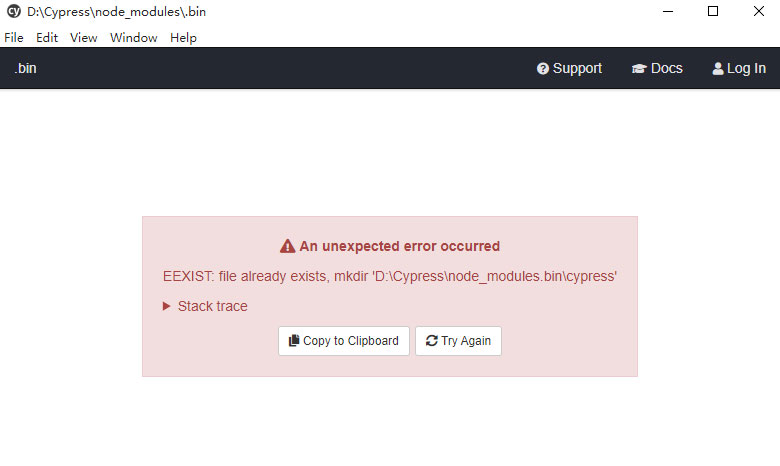 Error: EEXIST: file already exists, mkdir 'C:\cypress\node_modules\.bin\cypress'
