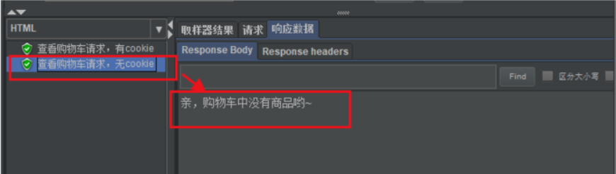 我们可以看到,两个请求都请求成功了。登陆请求中是没有Cookie信息的,登陆之后服务端会返回Cookie信息给客户端。而HTTP Cookie管理器组件保存了这些Cookie信息,并应用于之后的接口请求中,所以在查看购物车请求中,我们看到了Cookie数据。