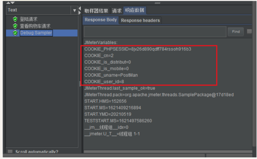 运行测试计划,然后在察看结果树中,查看Debug Sampler组件中的值。