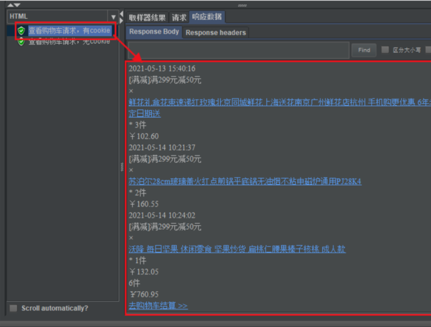 我们再来看一下带Cookie信息的请求结果,发现可以看到购物车中的信息,如下图所示: