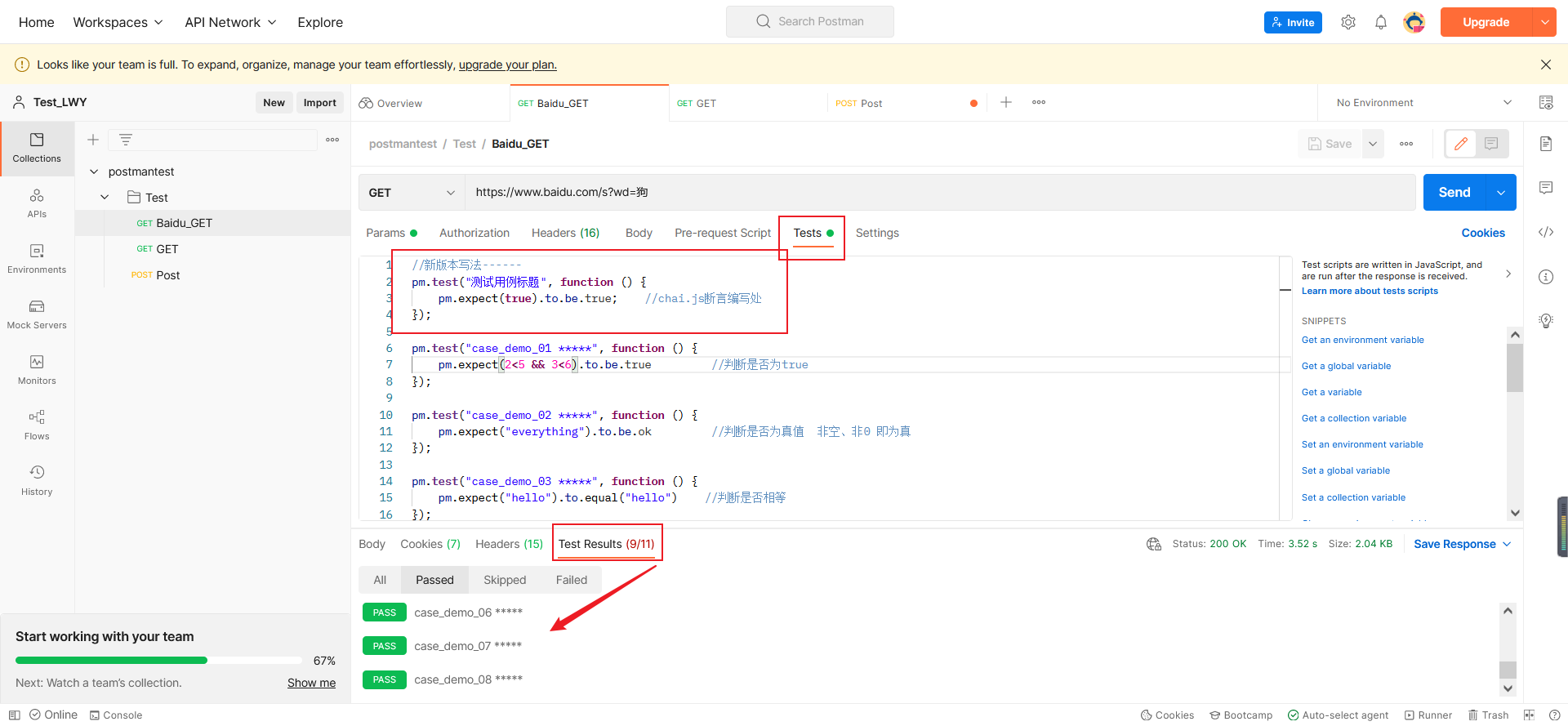 ②利用断言语句tests[]或chai.js形式把实际响应信息与期望结果对比;