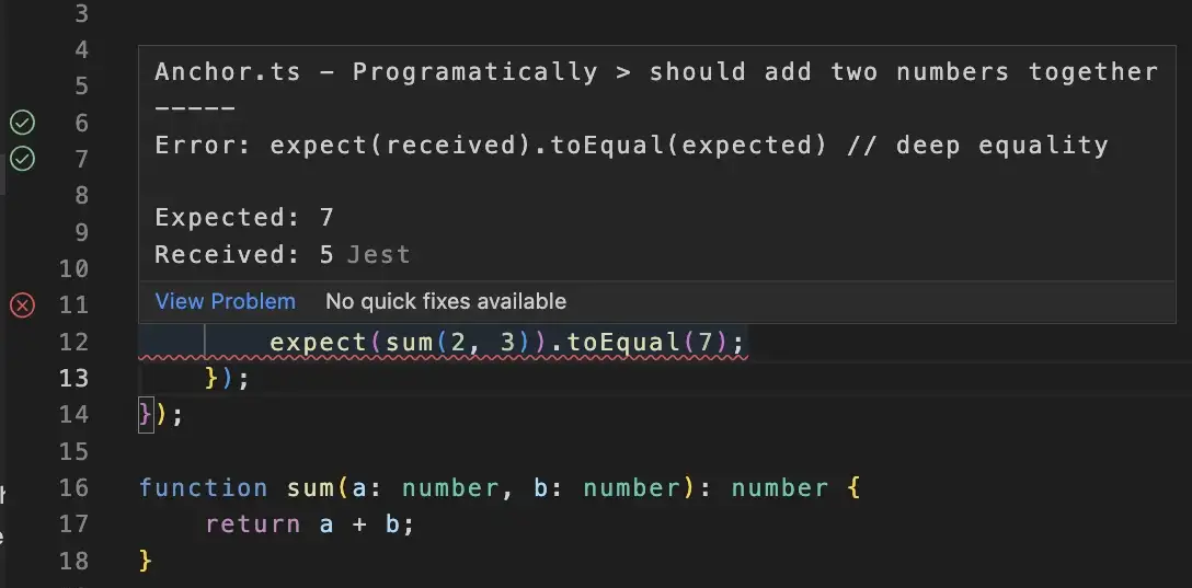 Jest 扩展在测试失败的地方添加了一个内联红色下划线,并显示详细的错误消息。 此外,可以在左侧看到所有测试的状态。<