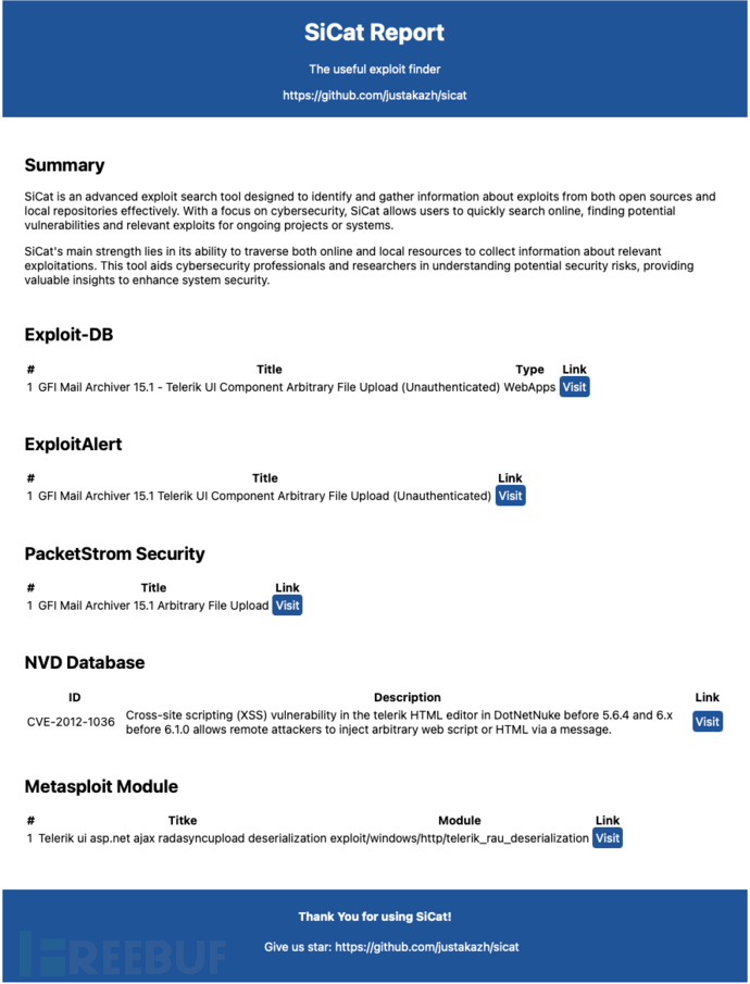 SiCat专注于网络安全管理方面的实践工作,允许研究人员快速实现在线搜索,并查找正在进行的项目或系统中的潜在安全问题和相关漏洞。SiCat的主要优势在于它能够遍历在线和本地资源来收集相关漏洞的信息,能够帮助网络安全专业人员和研究人员了解项目中潜在的安全风险,从而提供宝贵的实践方案以增强系统的安全性。