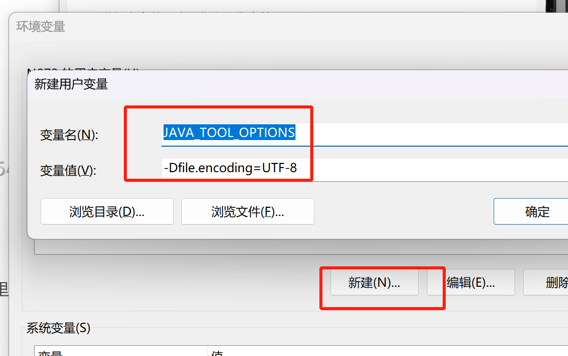 4、新建,添加环境变量 名称:JAVA_TOOL_OPTIONS 值:-Dfile.encoding=UTF-8