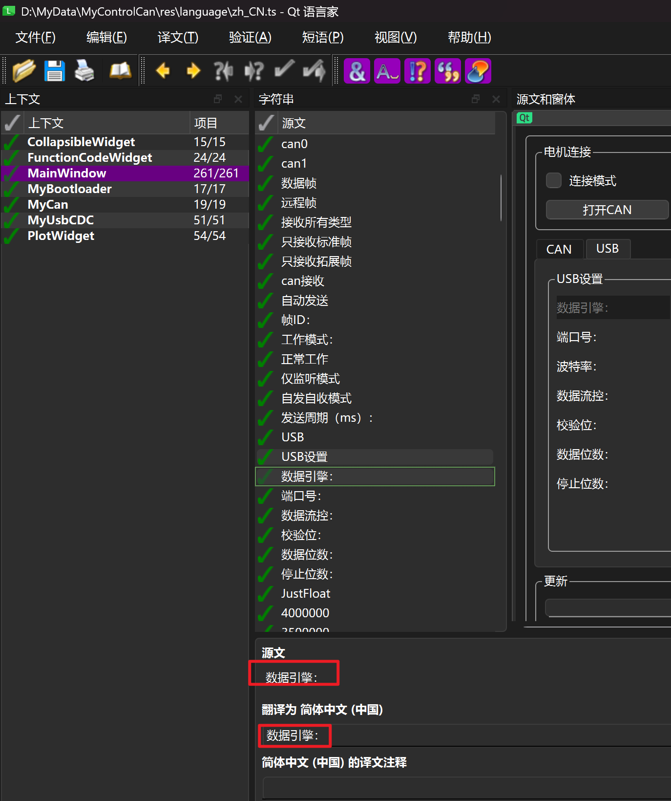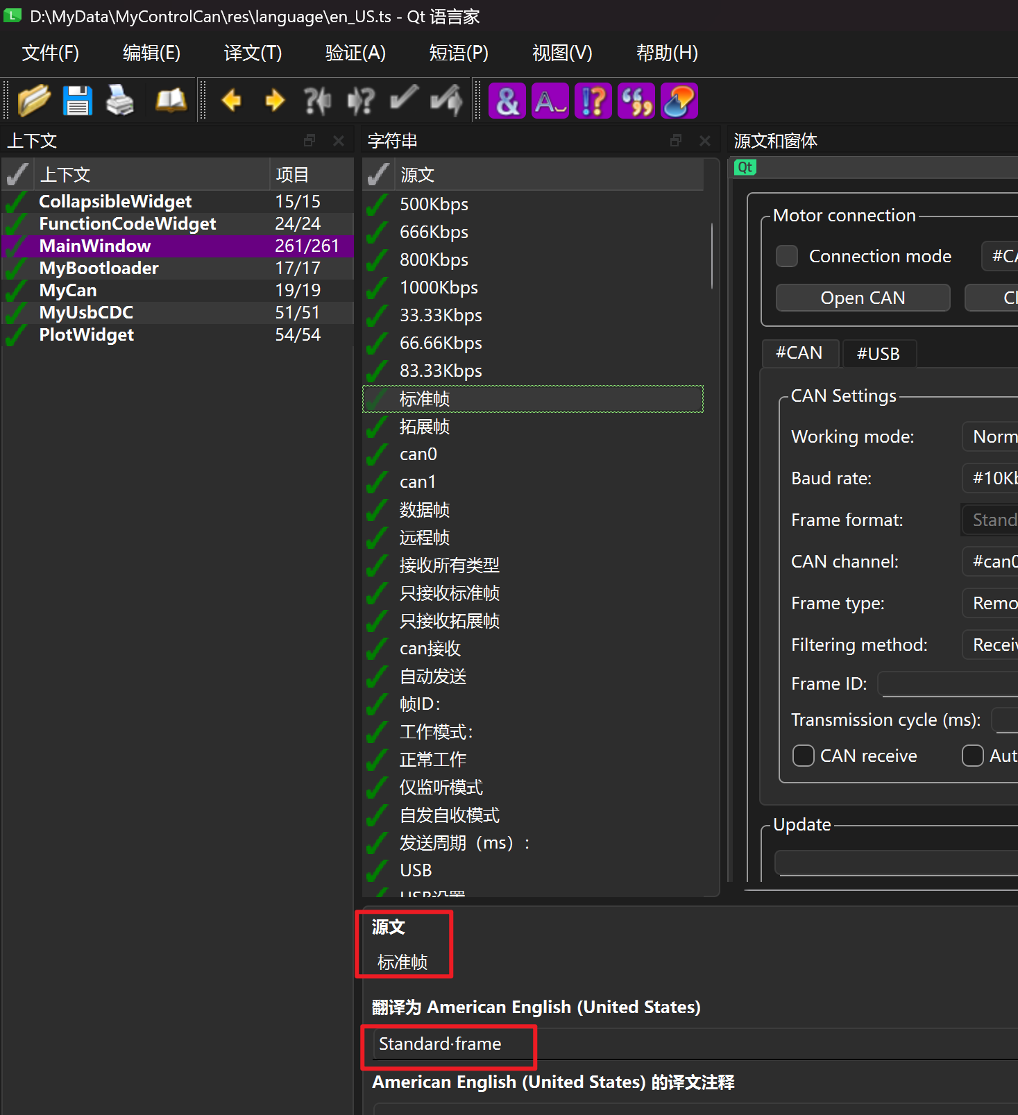 这里需要重新打开一个新的linguist6.9.1,再打开en_US.ts文件,不然的话源文和翻译为以及上下文好像无法切换,软件bug?