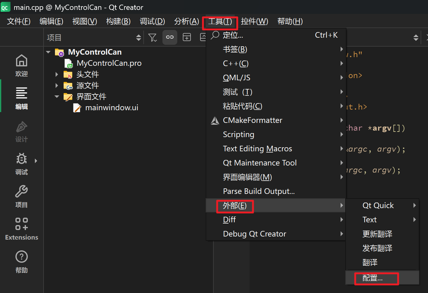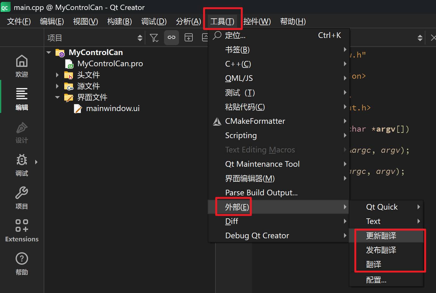 点击刚刚添加进入的:工具->外部->更新翻译,就会生成两个ts文件,下图中qm文件是后续翻译转换出来的。