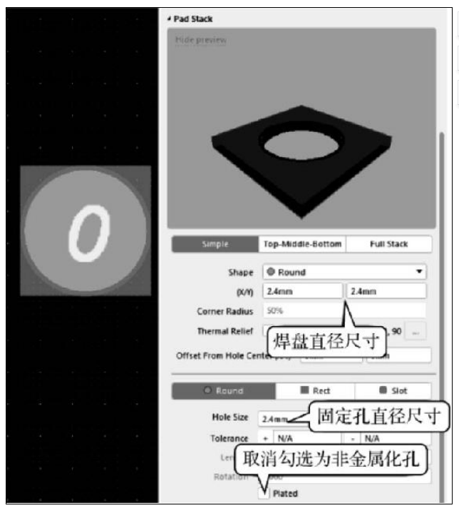 一般非金属化孔,焊盘和孔等大设置,比如这个例子,孔的大小和焊盘的大小都是2.4mm。