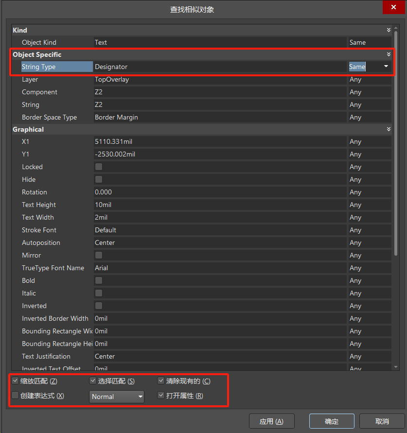 (2)在弹出的如图9-14所示的对话框中,对选项,选择“Same"于“Designator",表示只对同是“Designator”属性的丝印位号进行选择。值得注意的是,对于下方的选择适配项应进行选择性的勾选。