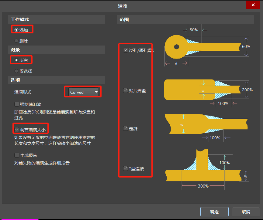 (4) 强制铺泪滴: 对于添加泪滴的操作采取强制执行方式,即使存在DRC报错,一般来说为了保证泪滴的添加完整,勾选此项,后期DRC再修正即可。