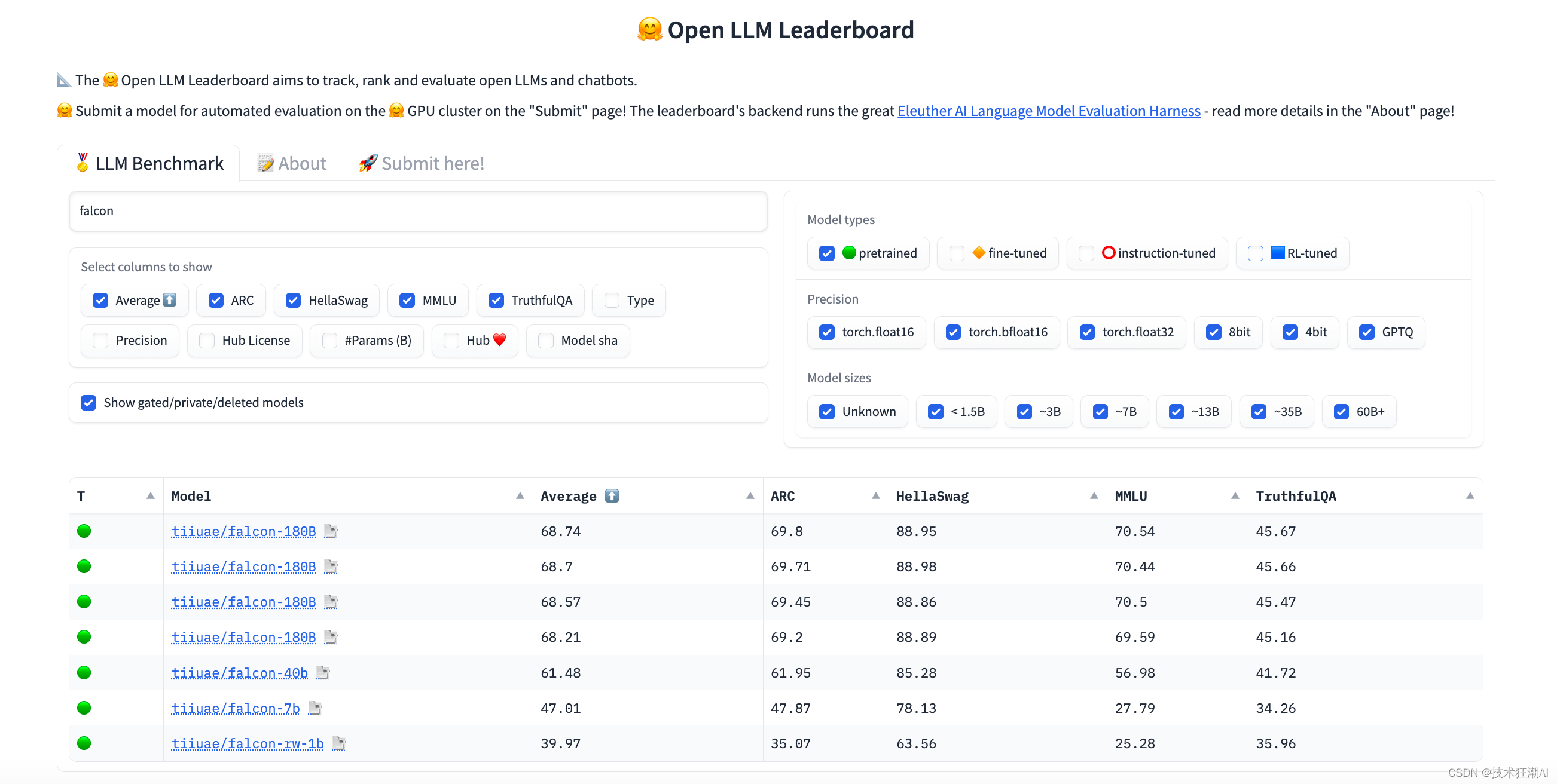 使用量化版本的模型:为了降低硬件要求,您可以考虑使用Falcon-180B的量化版本。量化模型在基准测试中表现相似,但参数规模更小,对硬件资源的需求较低。查看Open LLM排行榜中的结果,以获取有关量化模型性能的更多信息。