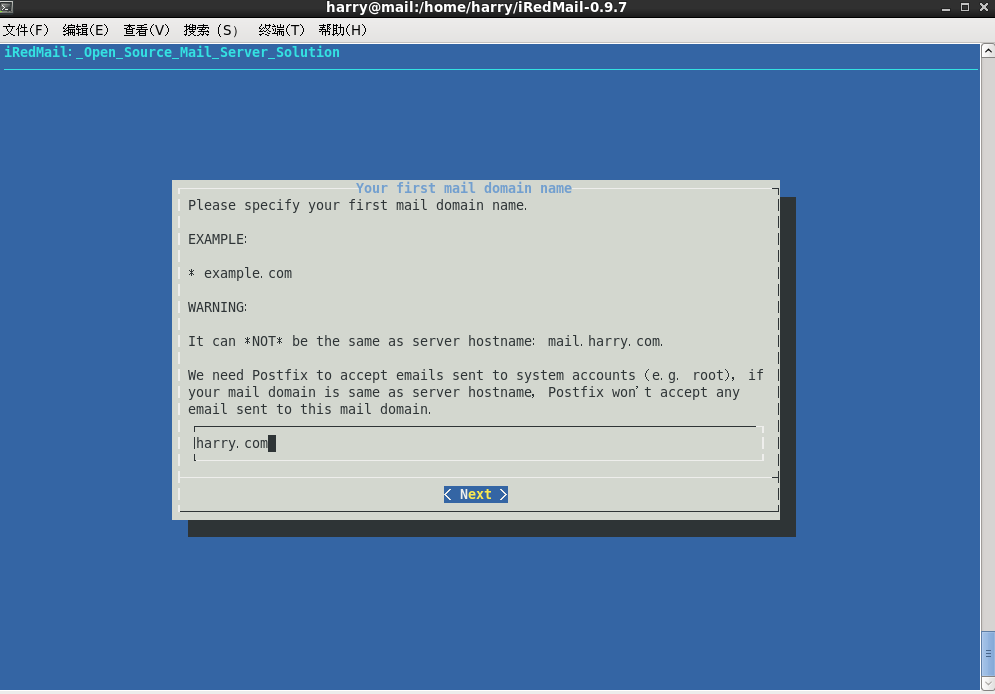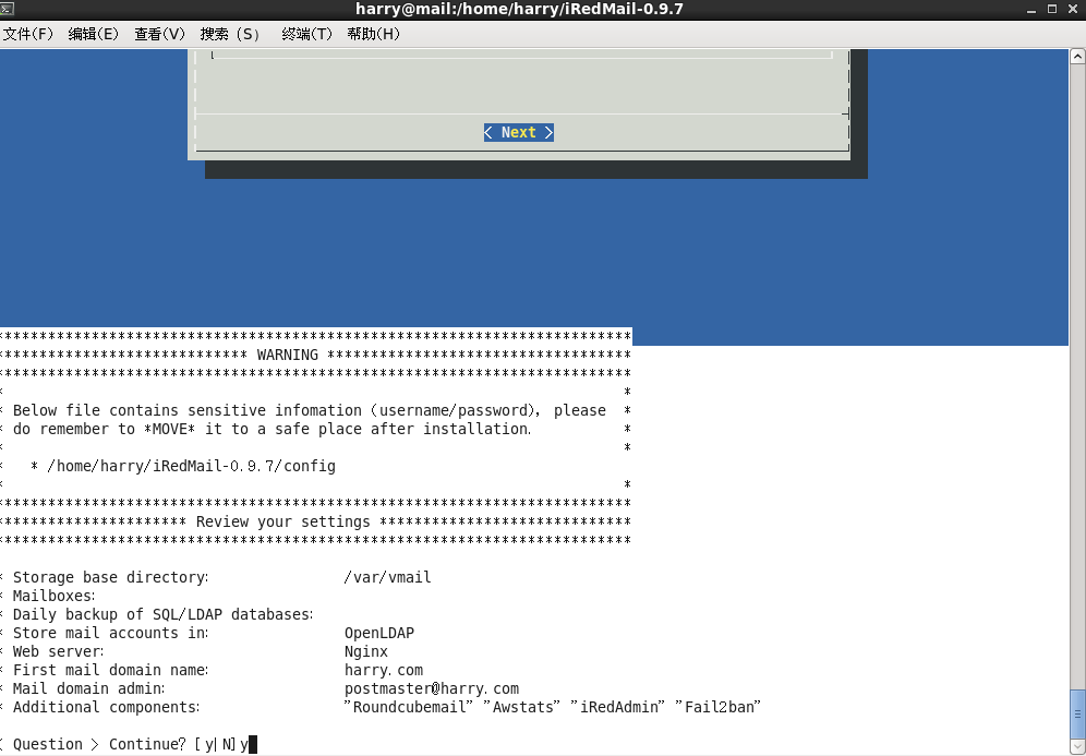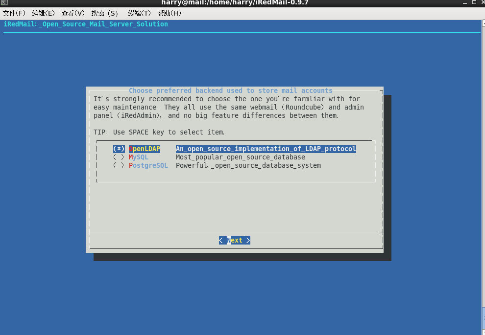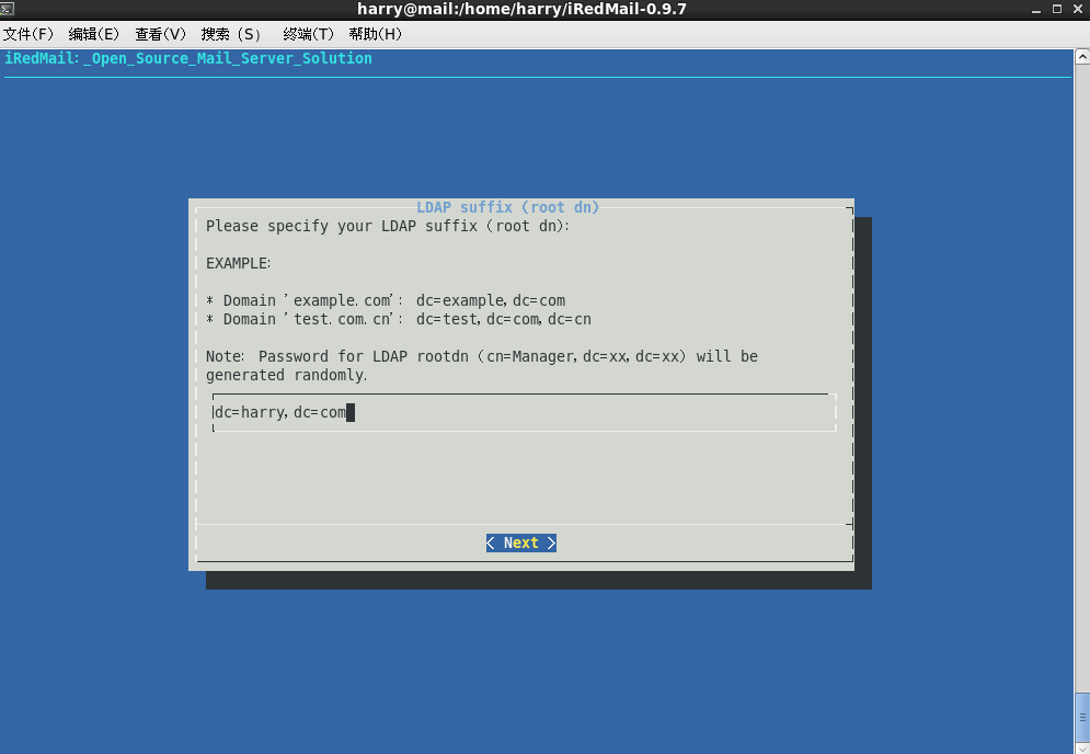· 如果选择 OpenLDAP 数据库用于存储邮件账号,安装程序会要求你输入 LDAP 前缀,将example改为harry