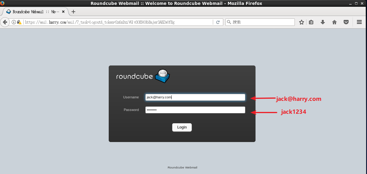添加邮箱用户jack(用户名:jack@harry.com; 密码:jack1234)