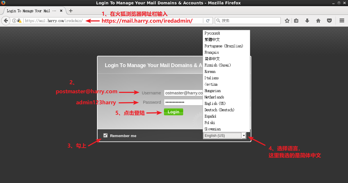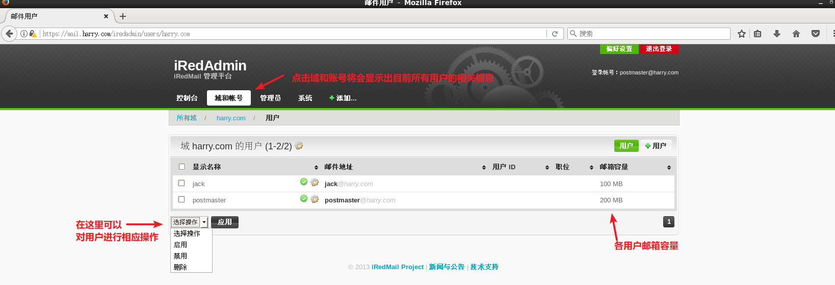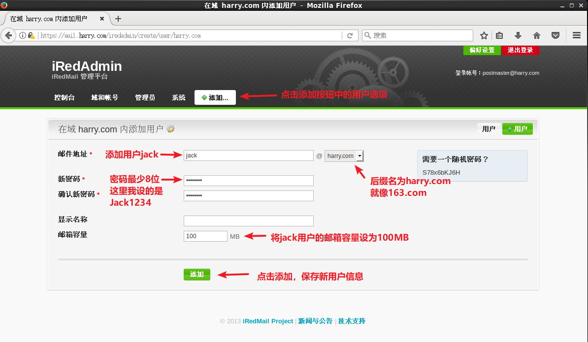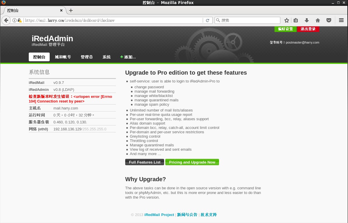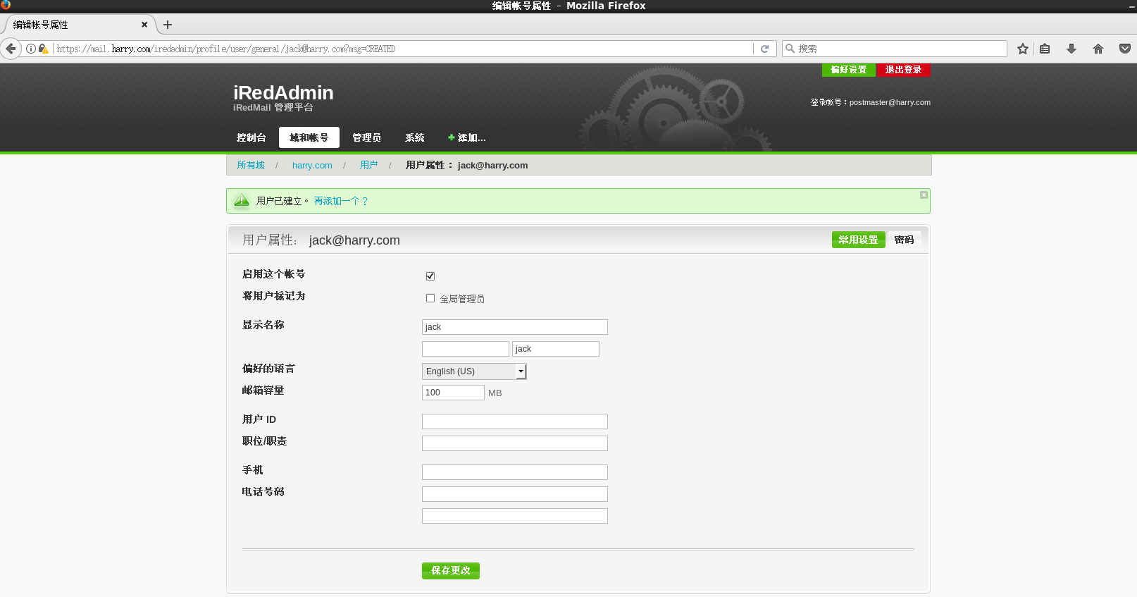 登陆IRedMail的管理员后台管理界面(http://mail.harry.com/iredadmin/)