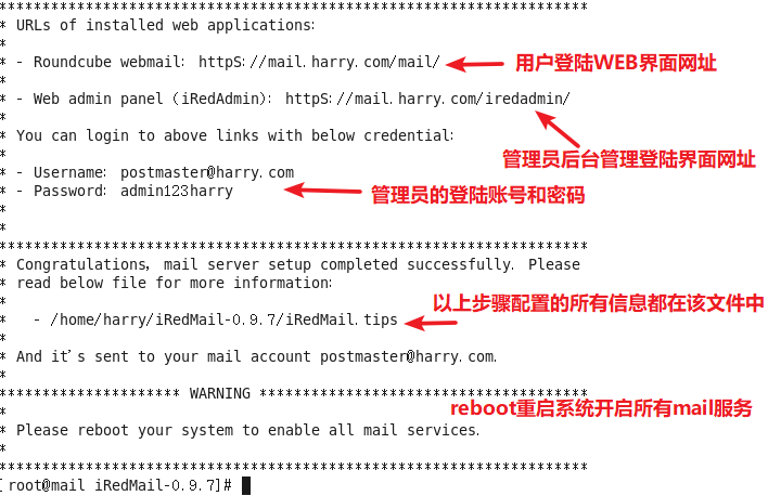 仔细阅读上面的信息,使用reboot命令或下面的命令重启机器来使所有的邮件服务启用。