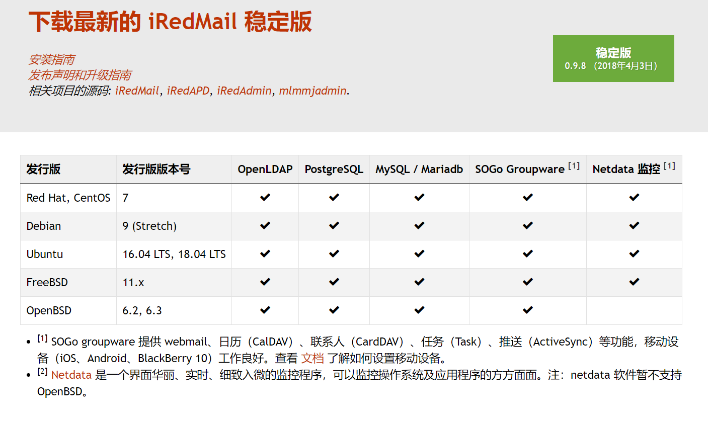 因为我的系统是CentOS6.8 64位的,这里我下载的版本是iRedMail-0.9.7.tar.bz2,注意要根据系统平台来选择相对应的iRedMail版本。下图是截至至2018年4月3号iRedMail-0.9.8.tar.bz2稳定版,给出的支持各系统和版本。