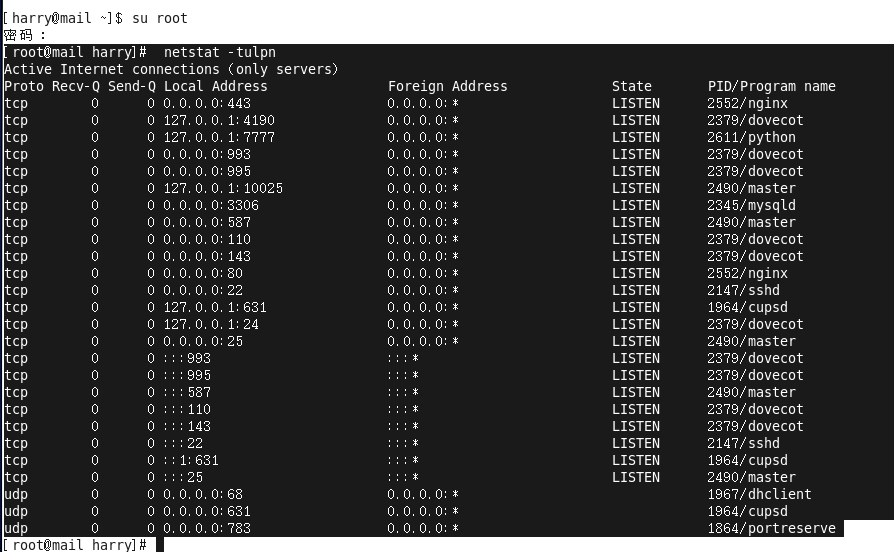 系统重启后,使用 root 权限的帐户登录或以 root 身份登录,并使用下面的命令列出所有的网络套接字以及你邮件服务器监听的相关程序。