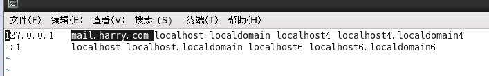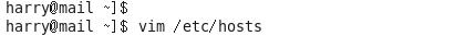 在普通用户权限下执行vim /etc/hosts命令进入hosts文件,按i进行编辑和插入,将原来的localhost改为mail.harry.com,按 shift ZZ 或输入 :wq 保存退出