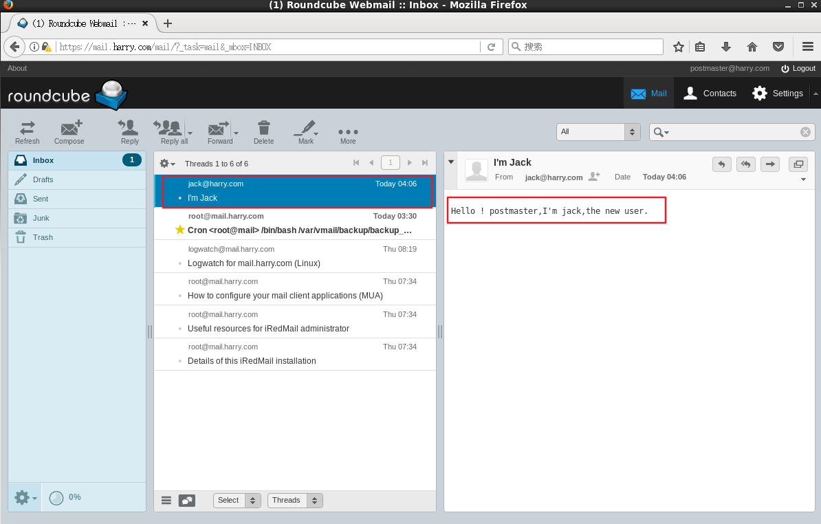 进入postmaster的用户界面,可以发现已经收到了来自jack的邮件