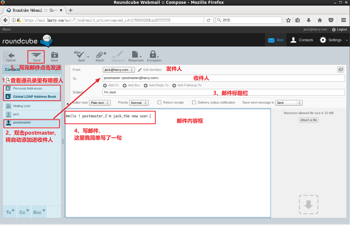登陆成功之后,我们让jack写一封信给postmaster吧!