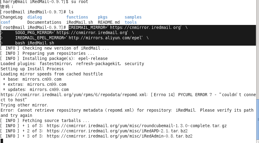 7、由于直接运行iRedMail.sh,文件内的域名解析在国内被墙。无法正常下载安装包。因此根据官方提供的中国用户安装命令来操作,要切换到root身份来执行命令 :