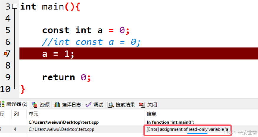 const是一个类型限定符,可以让变量变为只读常量,这样通过一般的赋值方式就不可以改变变量的值。