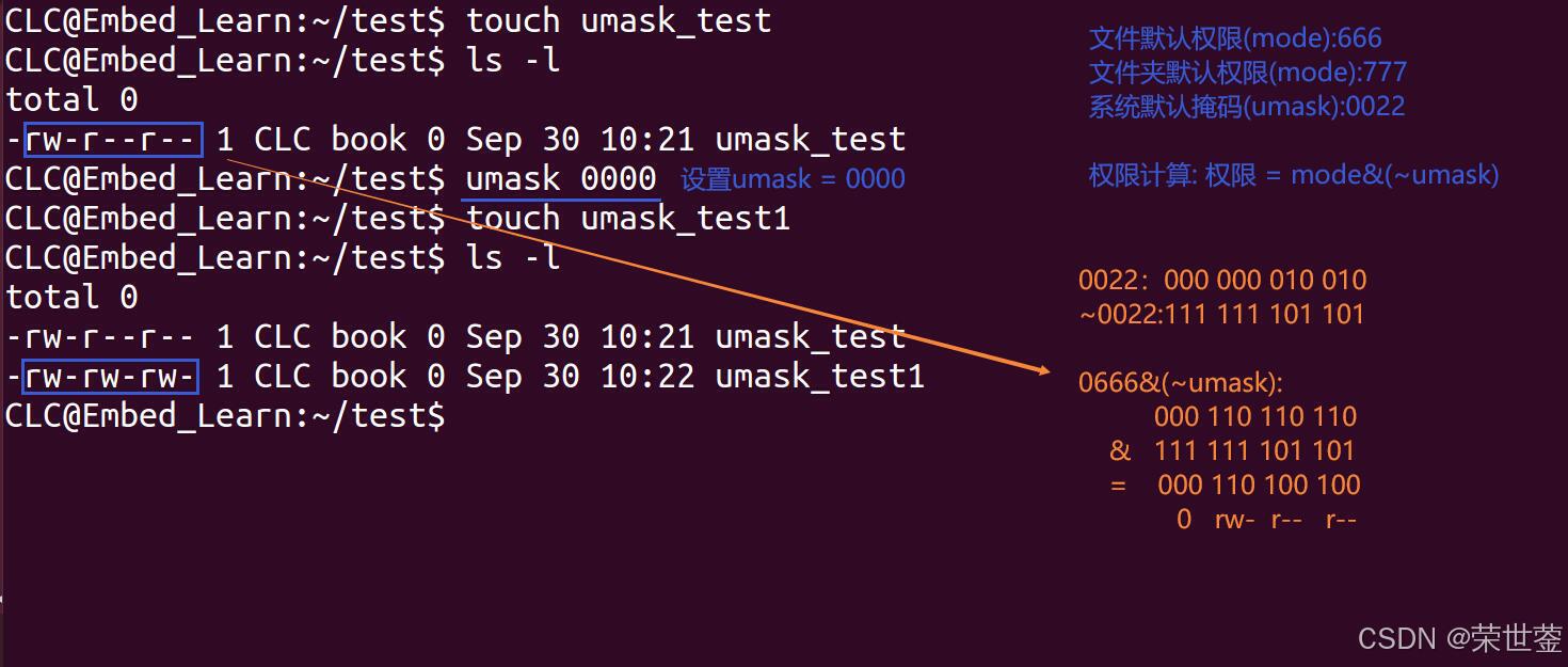 创建文件的默认权限为0666,创建目录的默认权限为0777。实际权限 = 默认权限 & (~umask)