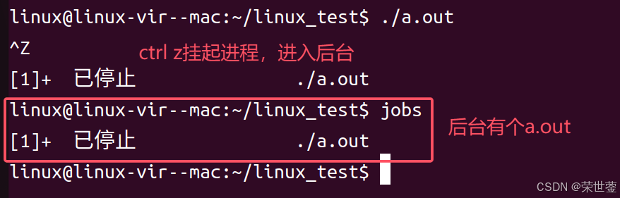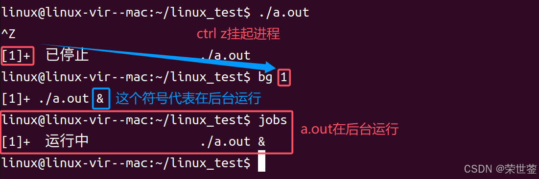在程序运行时,按ctrl z 可挂起进程,并让挂起的进程进入后台。