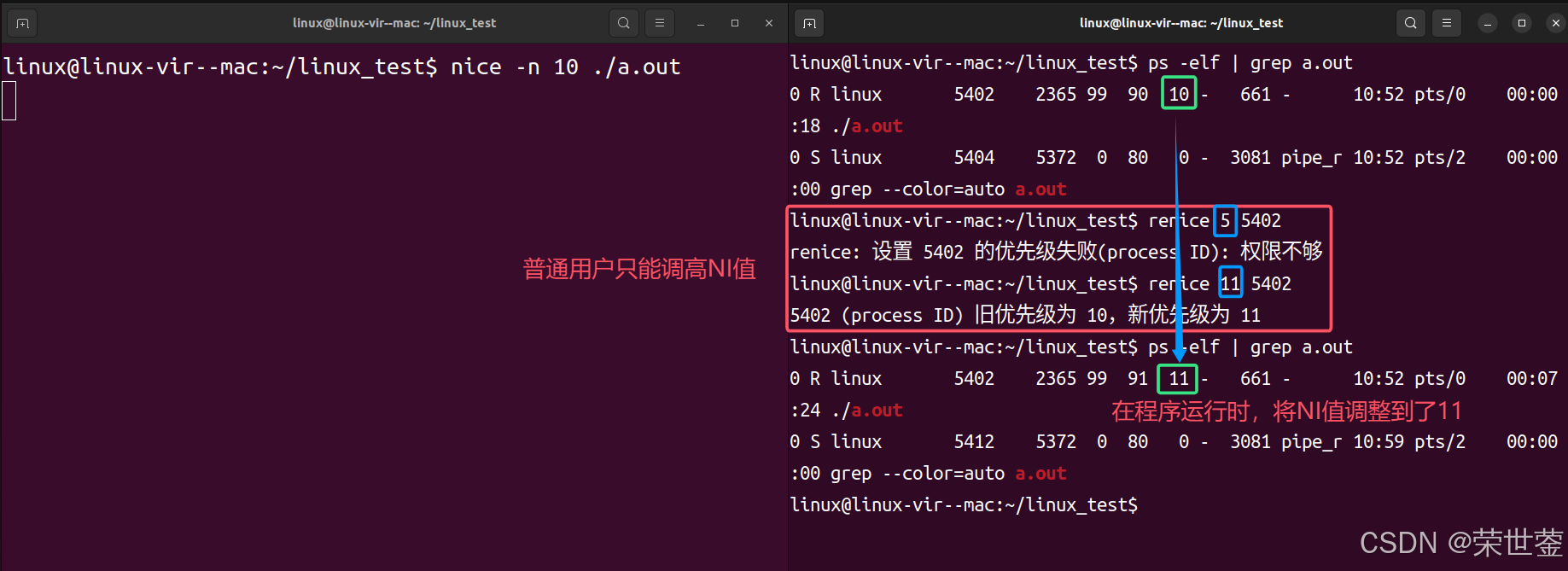普通用户只能调整自己的进程,NI值范围是0~19,并且只能调高NI值,不能调低NI值。