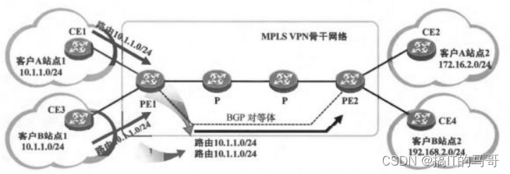 PE --- 服务提供商边界设备 --- 需要连接CE(客户网络的边界设备) 设备,则需要接受客户私 网的路由信息。他还需要将私网的路由信息传递到远端的PE设备上。这部分路由的传输主要 使用BGP协议来进行传递。则中间的P设备(服务提供商的设备) ,只需要完成路由信息的高 速转发即可。