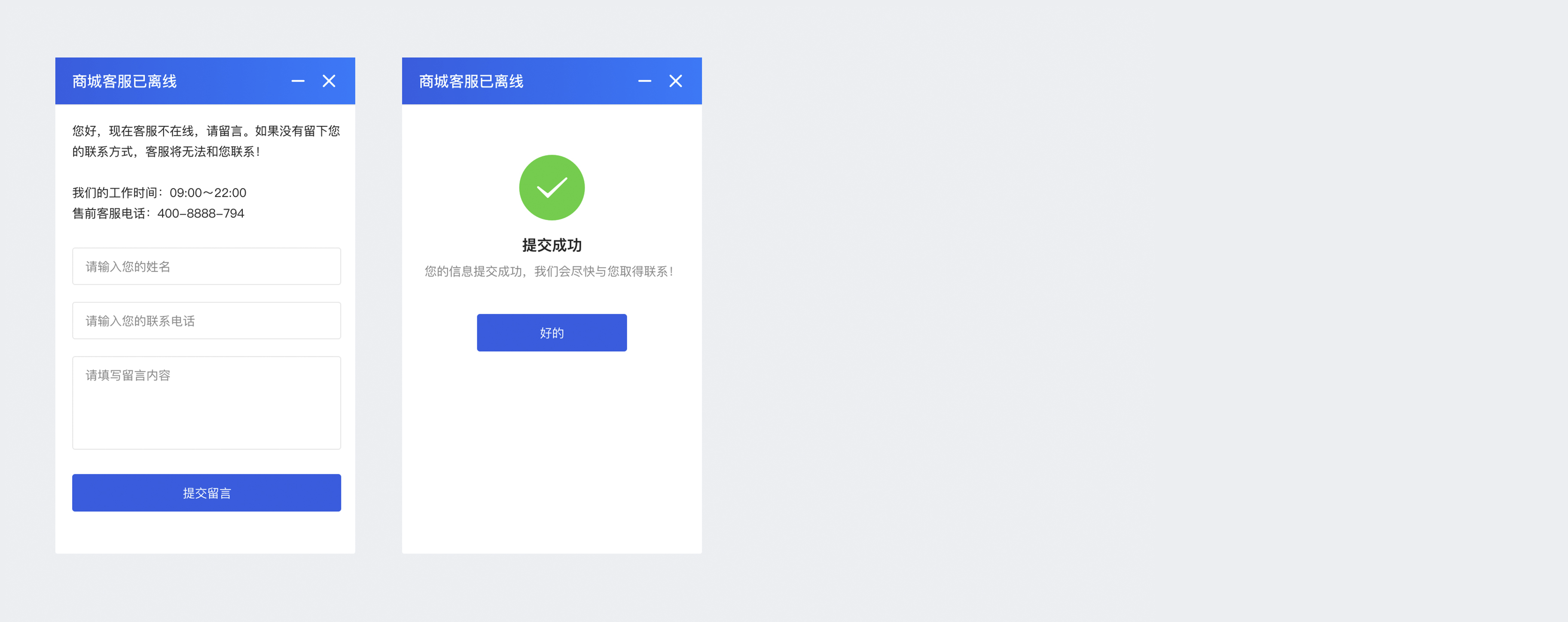 管理后台/设置/系统设置/商城配置/客服端配置 有系统客服/拨打电话/跳转链接可选,系统客服为系统自带的客服系统,拨打电话为用户点击联系客服为拨打客服电话的方式,跳转链接为可以跳转自己开发的客服系统或者第三方的客服系统或者企业微信的客服系统