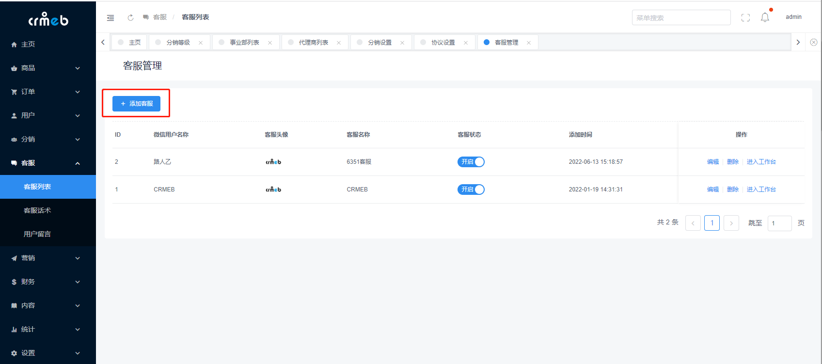 - 客服状态:开启或关闭此用户的客服身份,关闭后该用户的客服功能不能使用