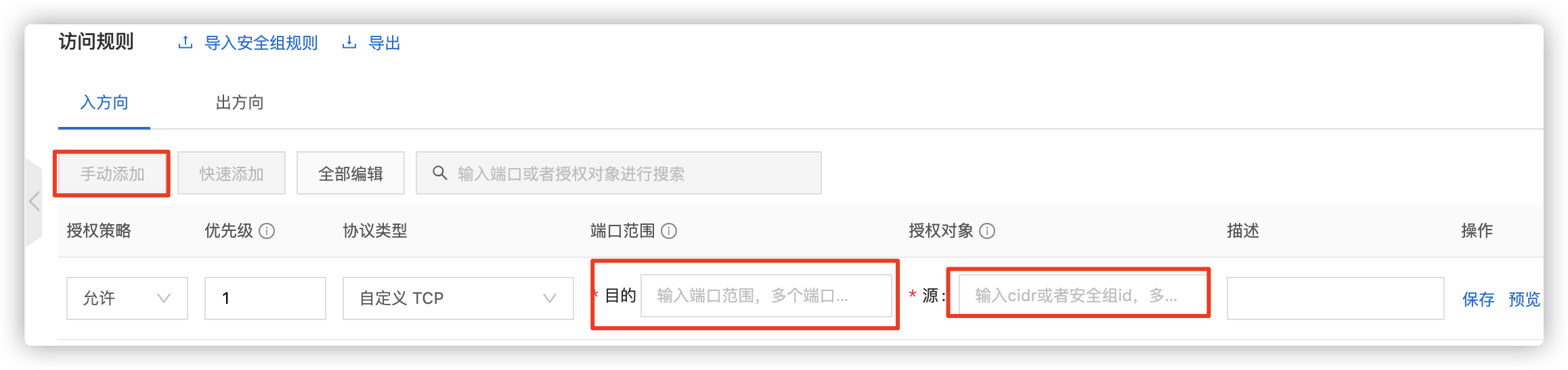 服务器需放行端口:80,21,8888,888,443,3306 具体操作如下: 1、配置规则 进入服务器实例列表,服务器,选择安全组,点击右侧配置规则 2、添加安全组规则 点击右上方添加安全组规则 3、添加端口 添加6个端口:80,21,8888,888,443,3306,授权对象:0.0.0.0/0 也可以选择手动添加,一次输入多个端口,复制上方端口,直接粘贴至“端口范围”即可,授权对象:0.0.0.0/0 服务器端口配置完成