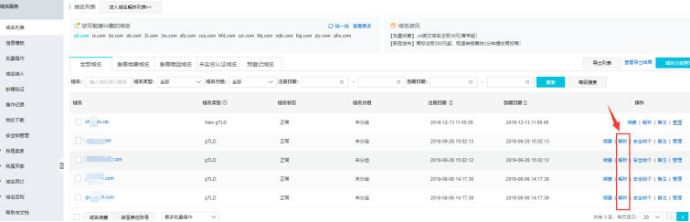选择你需要配置的域名,点击右侧解析