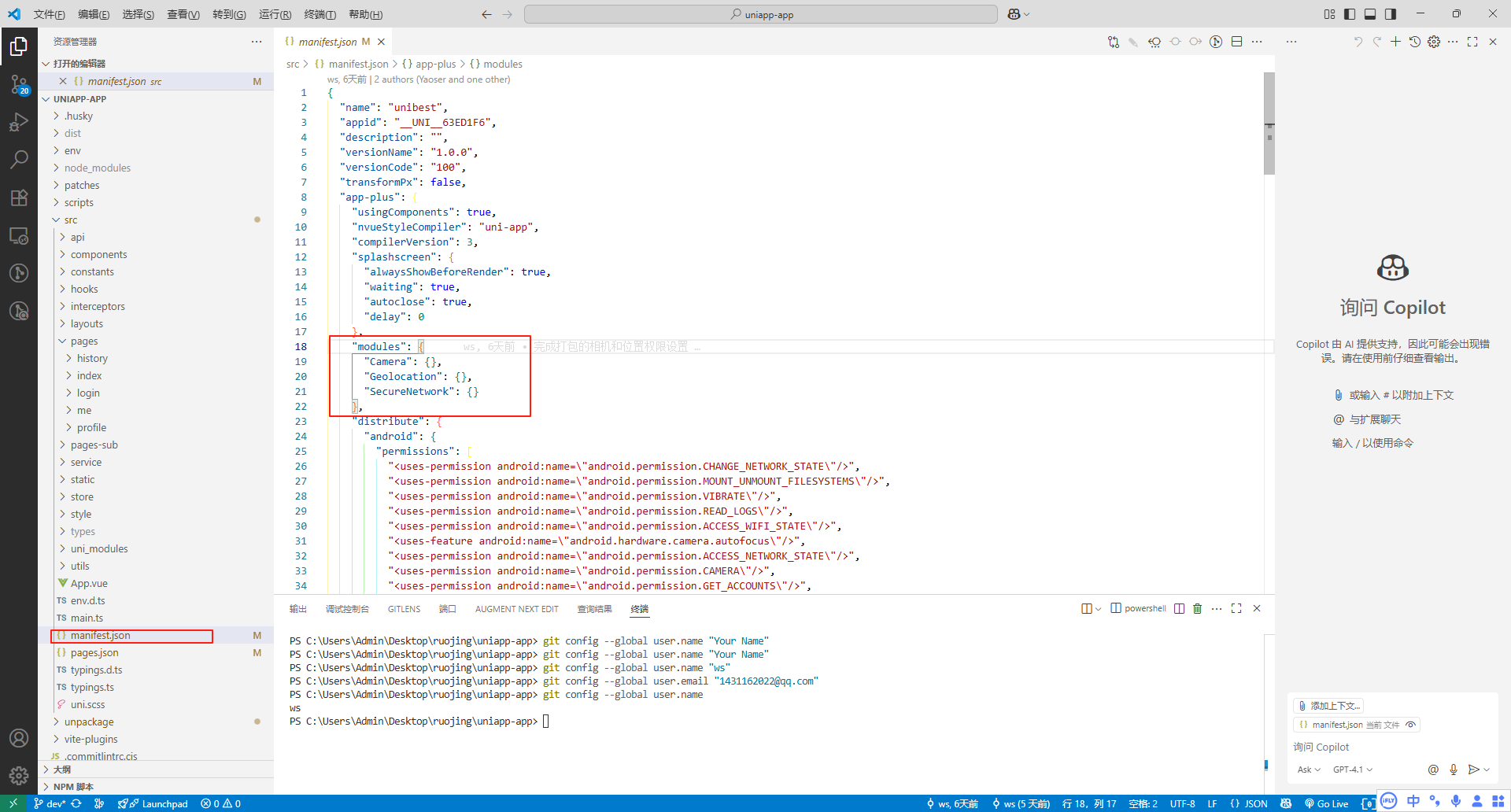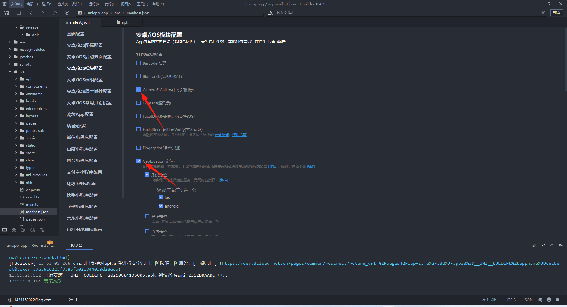 uni的项目还有一个manifest.config.ts,我们需要手动添加manifest.json相同的权限处理,再打包就可以了,因为这个manifest.config.ts是没有自动同步我们选择的设置的,在项目打包时会自动覆盖manifest.json的新增的权限配置,所以需要手动添加一遍(不会添加的可以让AI给你写进去)