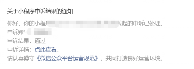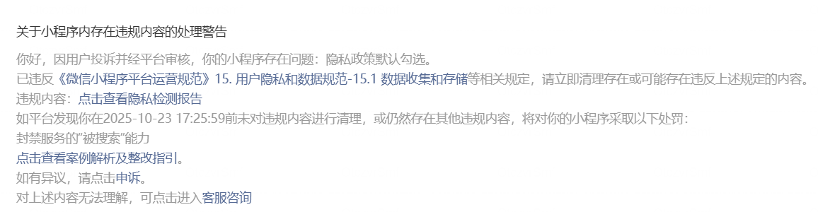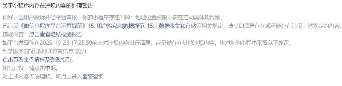 小程序被通知违规收集隐私信息,被封禁服务的“获取地理位置信息”能力和封禁服务的“被搜索”能力;