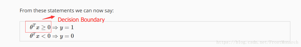 Decision boundary is a function of theta. It seperates the area of y=1 and y=0.