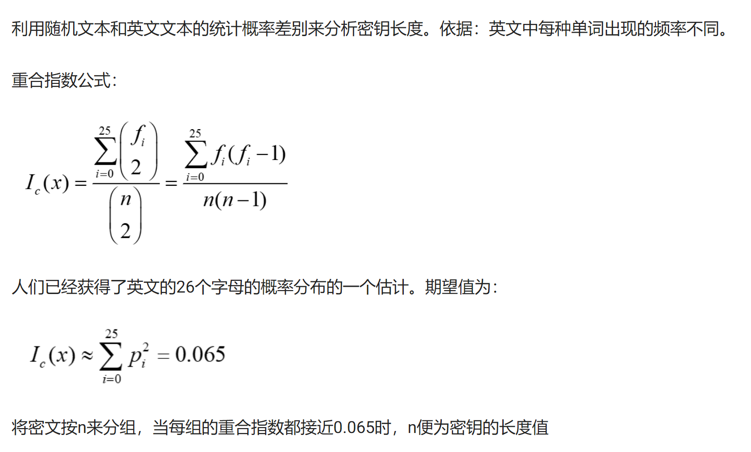 将Beker和Piper统计出的26个英文字母a, b, …, z的期望概率(仿射密码分析中用到的统计表)分别记为𝑝0,𝑝1,…,𝑝25. 设𝑥 为英文明文, 𝑥 中两个随机元素同时为第𝑖个英文字母的概率是𝑝𝑖