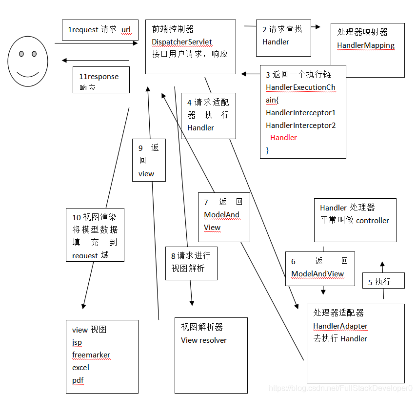 本文使用的是Spring3.x版本,比较老旧了,但是大部分功能是没问题,作者建议可以学习一下Spring4.x。文章主要是用来作复习使用。下面介绍一下SpringMVC的执行流程,后续会更新剩余内容。