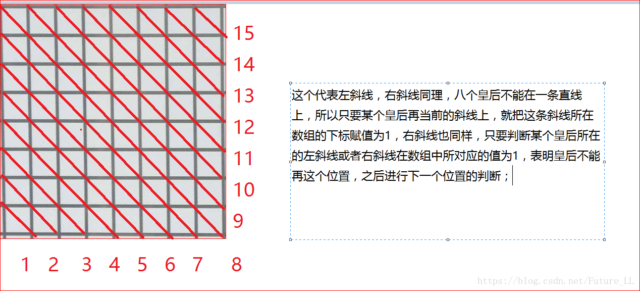 col[j]=left[i+j]=right[7+i-j]=1; //这一列,左斜线以及右斜线不能放置皇后;