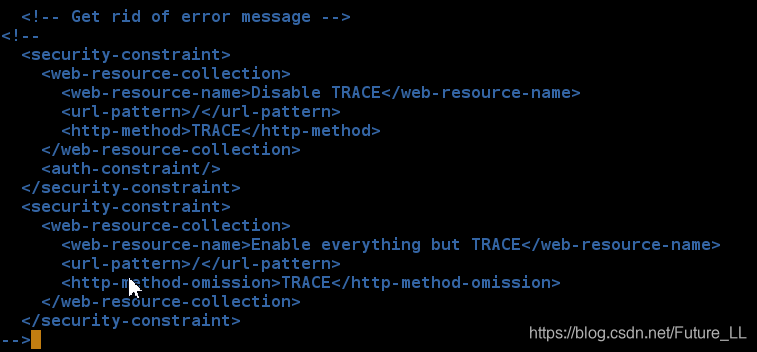 <security-constraint> <web-resource-collection> <web-resource-name>Disable TRACE</web-resource-name> <url-pattern>/</url-pattern> <http-method>TRACE</http-method> </web-resource-collection> <auth-constraint/> </security-constraint> <security-constraint> <web-resource-collection> <web-resource-name>Enable everything but TRACE</web-resource-name> <url-pattern>/</url-pattern> <http-method-omission>TRACE</http-method-omission> </web-resource-collection> </security-constraint>