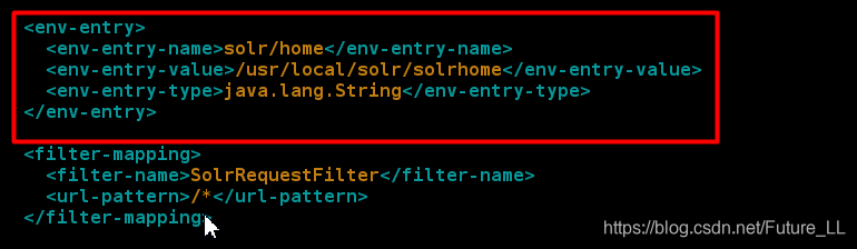 <env-entry> <env-entry-name>solr/home</env-entry-name> <env-entry-value>/usr/local/solr/solrhome</env-entry-value> <env-entry-type>java.lang.String</env-entry-type> </env-entry>